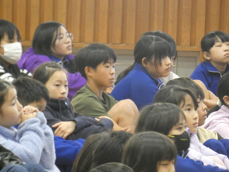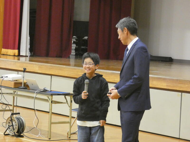 夏の暑い時期に一度来校され、6年生によるワークショップを行いましたが、その6年生達がオープニングに出演しての講演です。