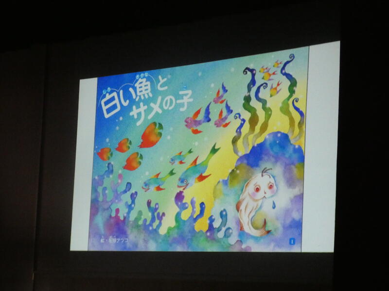まずはデジタル紙芝居「白い魚とサメの子」を鑑賞し、その後に人権についての講和を聞きました。