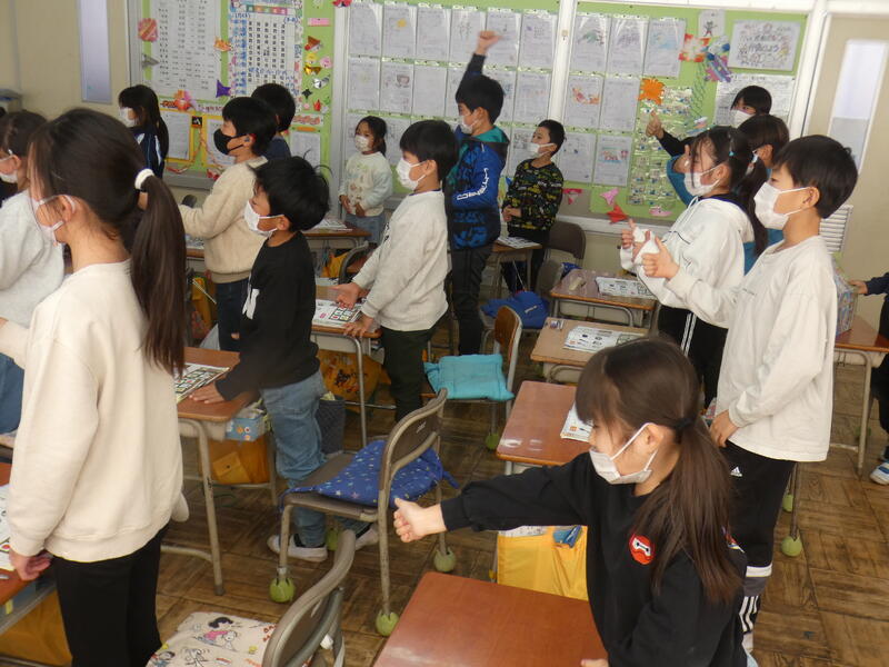 電子黒板に映し出された映像を見て、振り付けをしながら元気に歌っています。