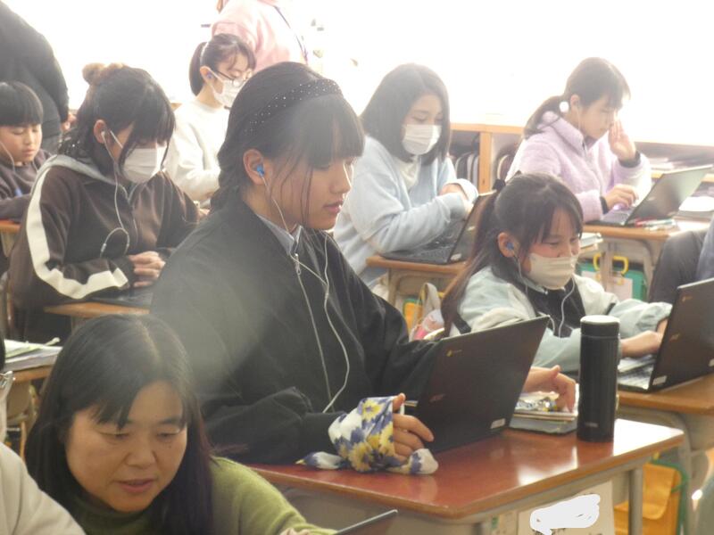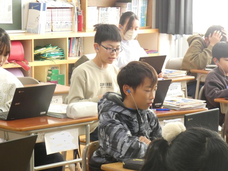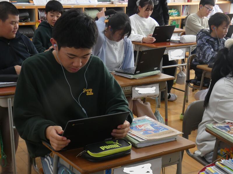 全体での練習もしますが、その後はイヤホンをタブレットにつけて、耳から入る発音を注意深く聞きながら発音をしていきます。
