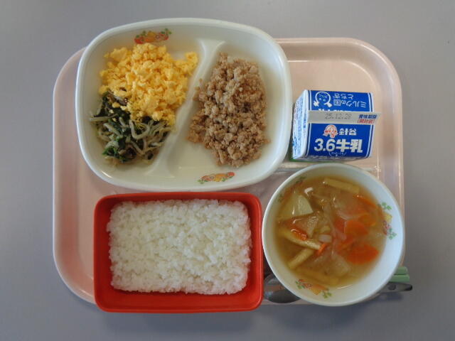 三色ごはん 牛乳 鶏そぼろ・卵そぼろ・おひたし 大根のみそ汁