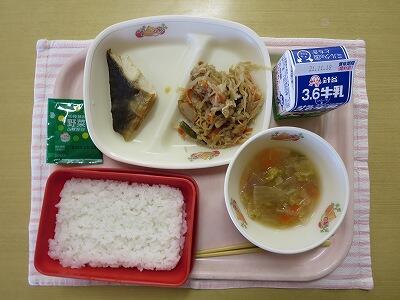 ごはん、牛乳、ぶりの照り焼き、ひじきの五目炒り煮、白菜のみそ汁