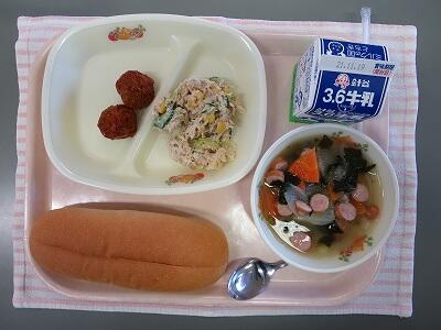 ごはん、牛乳、チキンのオーブン焼き、キャベツとほうれん草のツナ和え、さつまいものコンソメスープ