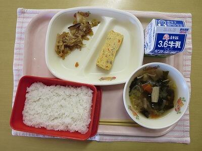 ごはん、牛乳、とちまる君の厚焼き玉子、ひじきの五目炒り煮、けんちん汁