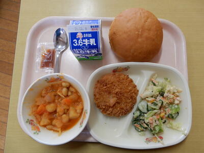 ココア米粉パン、牛乳、ホワイトグラタン、大豆のチリコンカン、フランクフルトと野菜の煮込みスープ