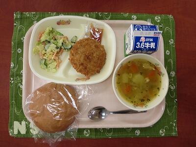 バターロール、牛乳、5種の野菜コロッケ・小袋ソース、ささみマヨサラダ、ベーコンと野菜のトマトスープ