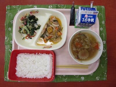 ごはん、牛乳、ミルメーク・コーヒー、豚キムチ炒め、ほうれん草とかにかまのごま和え、白菜と春雨のスープ