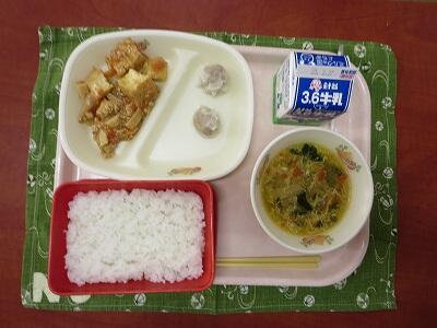 ごはん、牛乳、県産ポークシューマイ2ケ、厚揚げの麻婆炒め、中華卵スープ