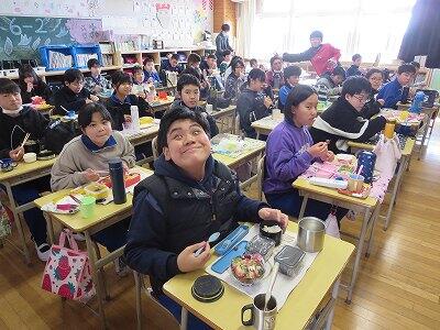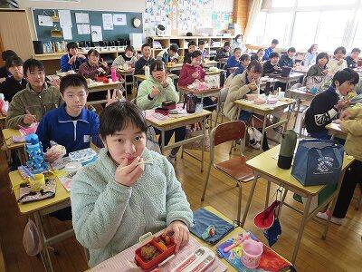 わかめごはん、牛乳、鶏天(大分県の郷土料理)、たくあん和え、いものこ汁(岩手県の郷土料理)