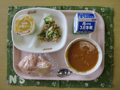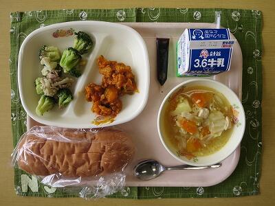 バターロール、牛乳、ミルメーク、鶏肉のトマトソース、イタリアンサラダ、オニオンスープ