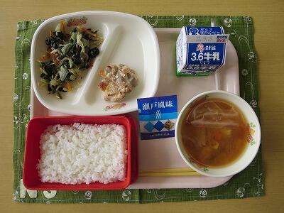 ごはん、瀬戸風味、牛乳、鶏肉の塩こうじ焼き、磯香和え、五目みそ汁