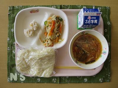 マーボー麺(中華麺)、牛乳、シューマイ2ケ、チョレギサラダ、マーボー麺のスープ