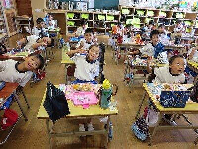 ミルクパン、苺ミックスジャム、牛乳、オムレツのトマトソースかけ、シーザーサラダ、お星さまのフルーツポンチ(杏仁豆腐入り)