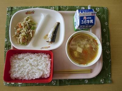 ごはん、牛乳、いわしのごまみそ煮、切干大根のサラダ、根菜たっぷり豚汁