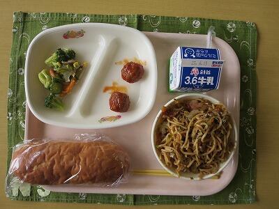 小さいコッペパン、牛乳、ミートボール2ケ、ミモザサラダ、焼きそば