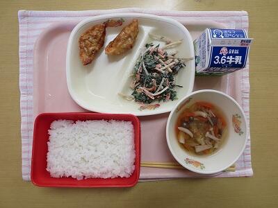 ごはん、牛乳、餃子の甘酢あんかけ、ごぼうサラダ、きのこと白菜のスープ