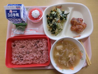 赤飯・牛乳・花形豆腐ハンバーグの和風ソース・ほうれん草のごま和え・豚汁・いちごのお祝いデザート