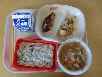 わかめごはん、牛乳、さわらの西京焼き、じゃがいものそぼろ煮、せんべい汁