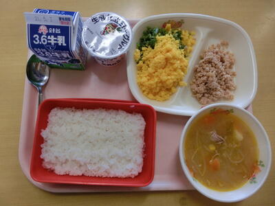 三食ご飯、牛乳、鶏そぼろ、卵そぼろ、いんげん和え、どさんこ汁、県産生乳ヨーグルト