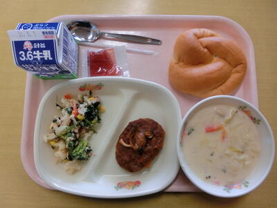 米粉パン、いちごジャム、牛乳、ハンバーグのデミソースかけ、カラフルサラダ、旬のキャベツのクリームスープ