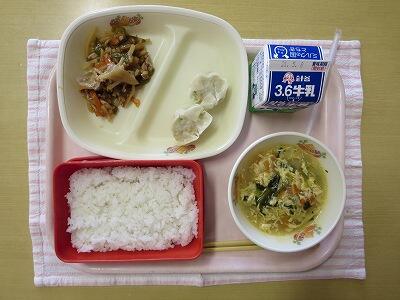 ごはん、牛乳、枝豆シューマイ2ケ、青椒肉絲、五目卵スープ
