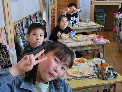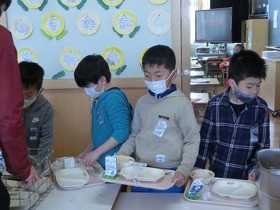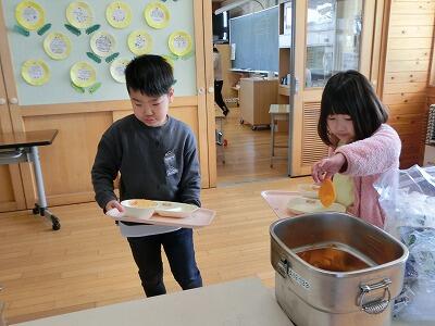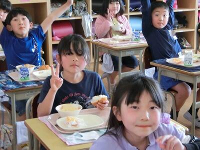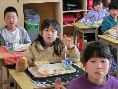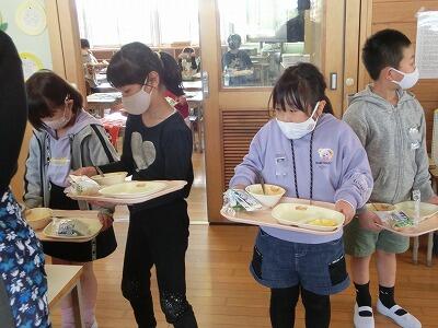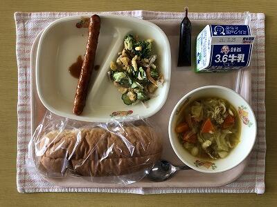 ホットドック(コッペパン)、牛乳、ミルメーク、ウインナー、スイートコーンのサラダ、春キャベツのカレースープ