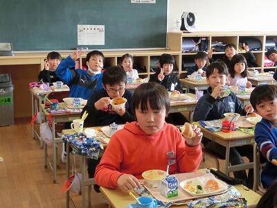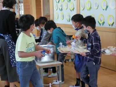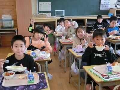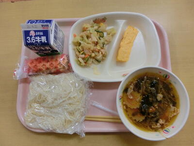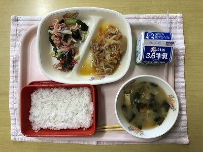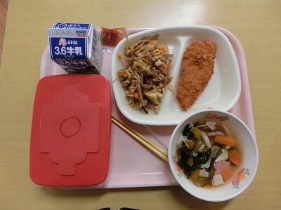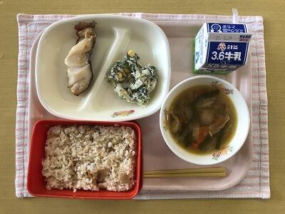 五目ごはん、牛乳、白身魚の西京焼き、ほうれん草とキャベツのツナ和え、ちゃんこ汁
