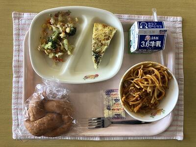 苺の米粉パン、牛乳、スペイン風オムレツ、ブロッコリーとコーンのサラダ、スパゲティボロネーゼ、粉チーズ(小袋)