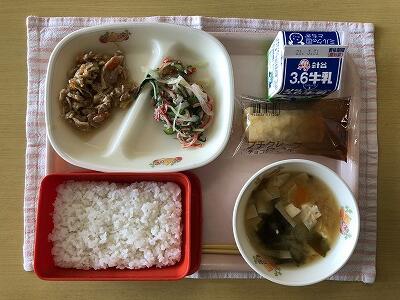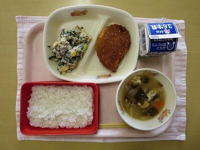 ごはん、牛乳、たれカツ、ほうれん草とキャベツのツナ和え、みだくさん汁