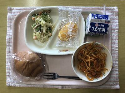 小さいバターロール、牛乳、アスパラとチキンのサラダ、スパゲティナポリタン、オレンジ