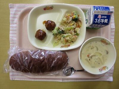 黒パン、牛乳、ミートボール2ケ、ブロッコリーとツナのサラダ、クラムチャウダー