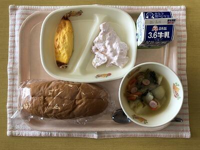苺クリームサンド(コッペパン)、牛乳、ツナマヨオムレツ、苺フルーツクリーム、野菜とポトフ