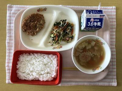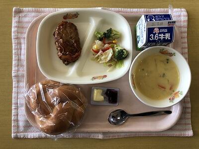 米粉パン、牛乳、ブルーベリー&マーガリン、県産ハンバーグのきのこソース、カラフルサラダ、コーンシチュー