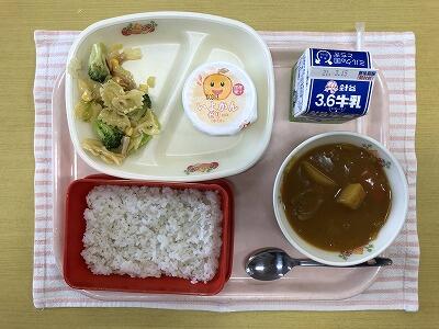 横須賀海軍カレー(麦ごはん)、牛乳、ファルファーレのサラダ、伊予柑ゼリー