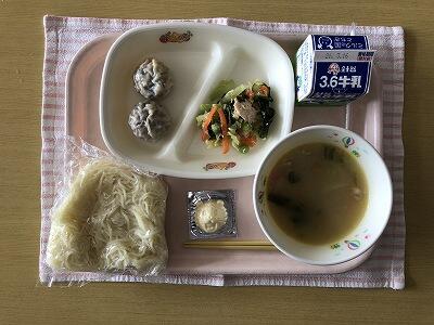 ちゃんぽん麺(中華麺・ちゃんぽん麺スープ)、牛乳、てんぐにらまんじゅう2ケ、中華風わかめサラダ、型抜きチーズ