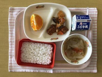 ごはん、牛乳、豚肉の酢豚風、ワンタンスープ、デコポン