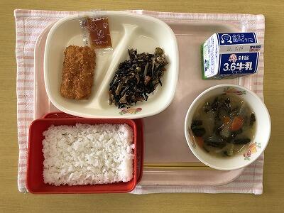 ごはん、牛乳、国産ふっくら鮭フライ・ソース、ひじきの五目炒り煮、みだくさん汁