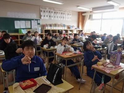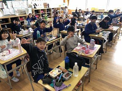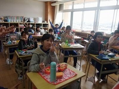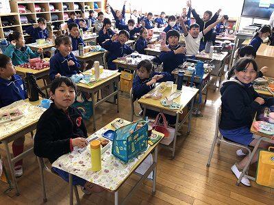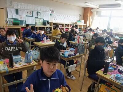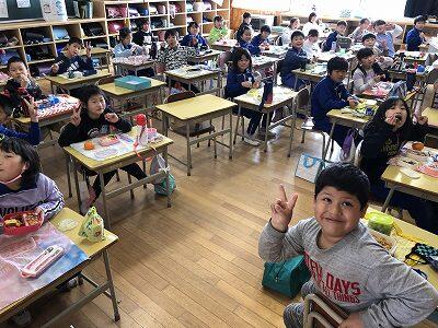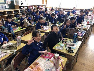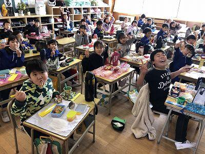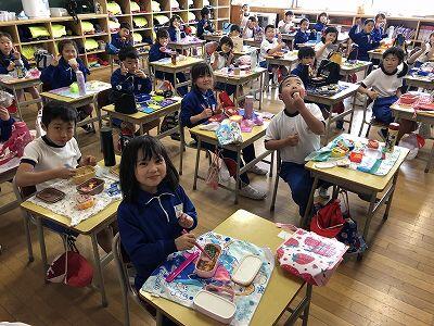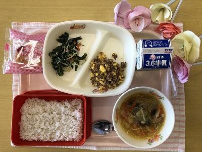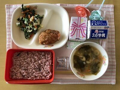 赤飯、牛乳、ごま塩、油淋鶏、ほうれん草と白菜のごま和え、わかめと油揚げのみそ汁、お祝いケーキ(いちご)