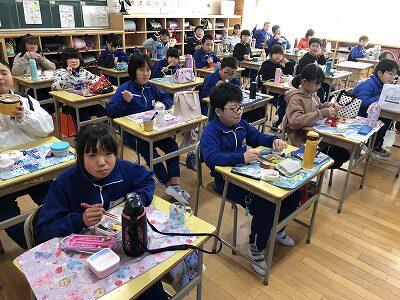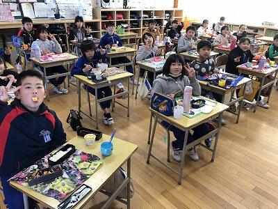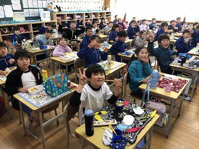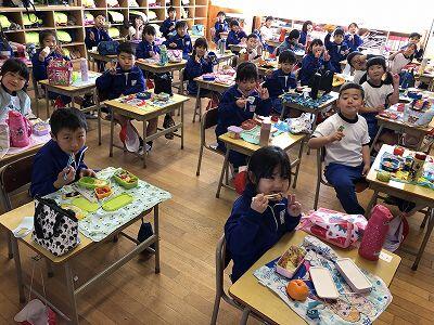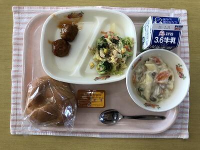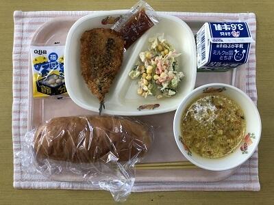 アップルパン、牛乳、いわしのフライ・ソース、福豆、ささみマヨサラダ、洋風卵スープ