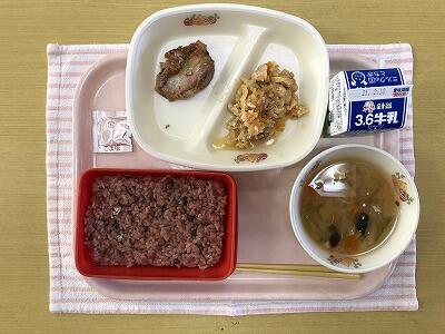赤飯、牛乳、ごま塩、鶏肉の朝鮮焼き、しもつかれ、ゆばのみそ汁