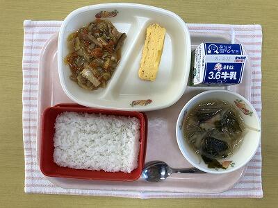 セルフ中華丼、牛乳、厚焼き玉子、中華丼の具、わかめと春雨のスープ