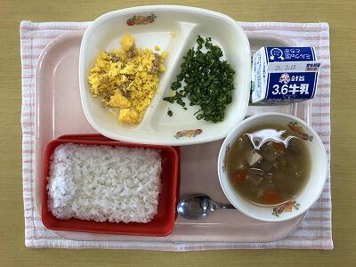 三色ごはん、牛乳、鶏そぼろ、卵そぼろ、いんげん和え、味噌けんちん汁