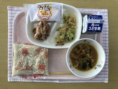 味噌ラーメン(中華麺・味噌ラーメンスープ)、牛乳、鶏のから揚げ、春雨の中華和え、チーズタルト