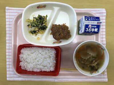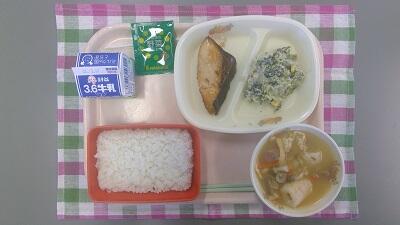 ごはん、牛乳、野菜ふりかけ、ブリの照り焼き、ほうれん草とキャベツのツナ和え、きりたんぽ汁