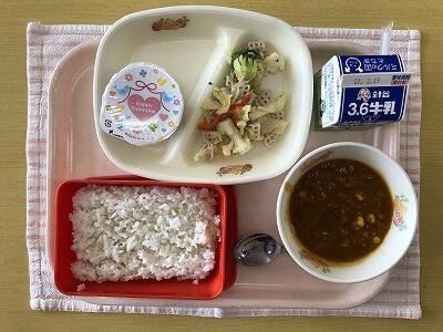 キーマカレー(麦ごはん)、牛乳、ハートパスタのサラダ、チョコプリン(豆乳)