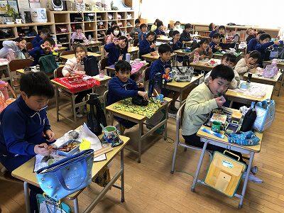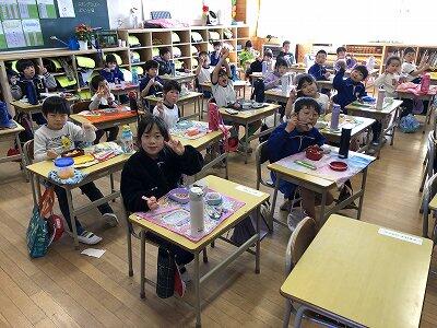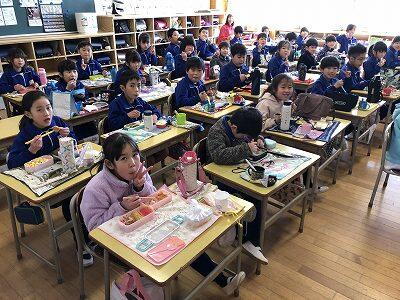 ごはん、牛乳、ハンバーグの和風ソースかけ、菜の花の卵そぼろ和え、具だくさん汁