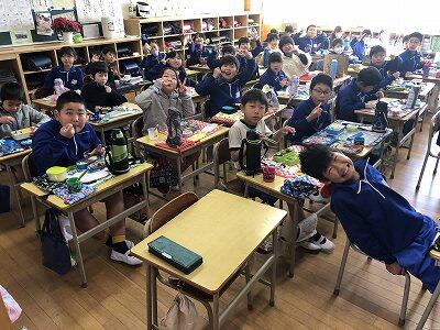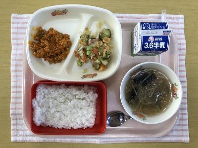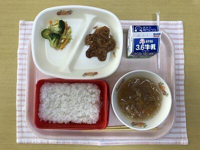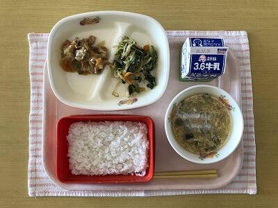 ごはん、牛乳、野菜入り焼き肉、ほうれん草と白菜のごま和え、五目卵スープ