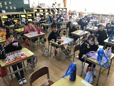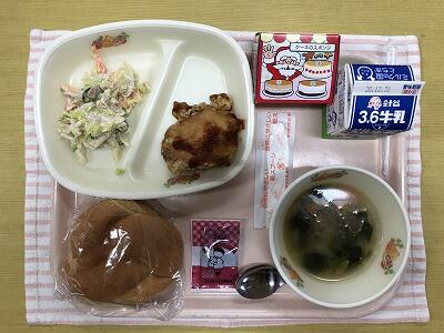 米粉パン、牛乳、チョコ大豆クリーム、鶏肉のトマトソースかけ、ツナ入りマカロニサラダ、コンソメスープ、サンタさんのケーキ
