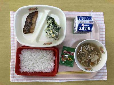 ごはん、牛乳、のりたま、ミナミカマスのスタミナ焼き、ほうれん草のツナ和え、せんべい汁