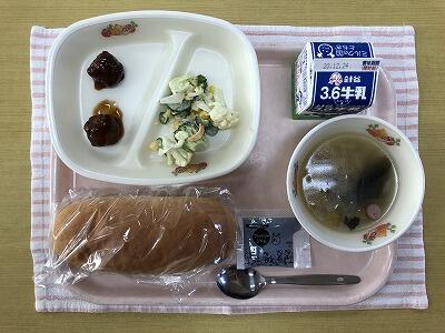 コッペパン、牛乳、ブルーベリージャム、ミートボール2ケ、スイートコーンのサラダ、ウインナーと野菜のスープ